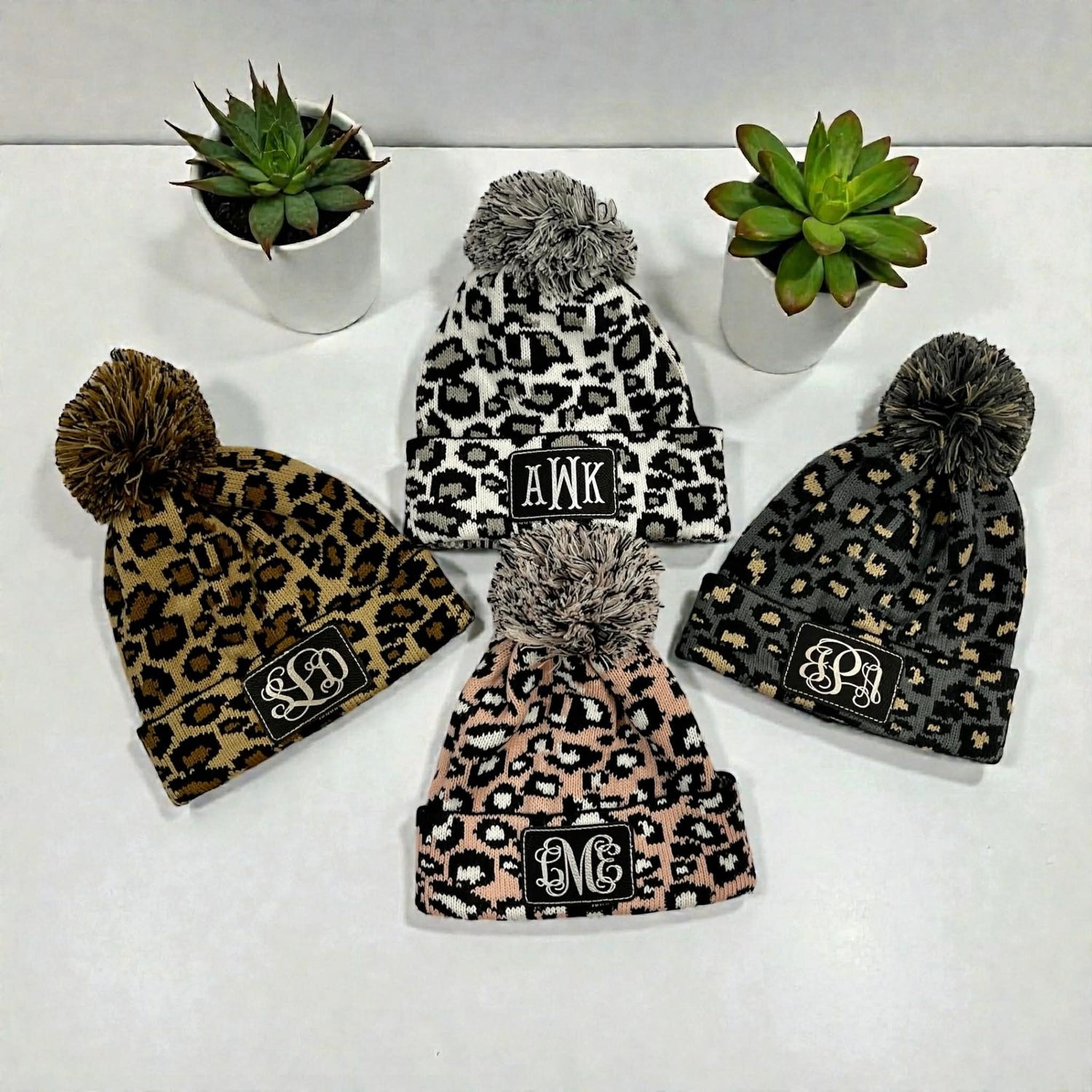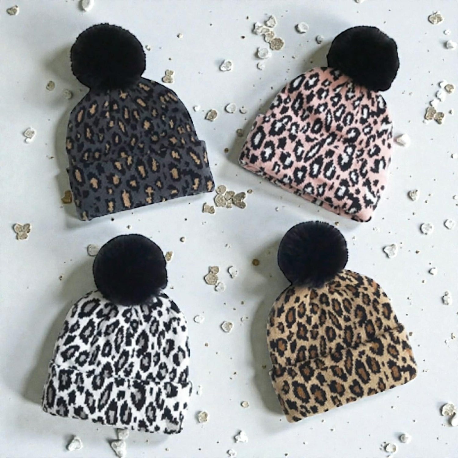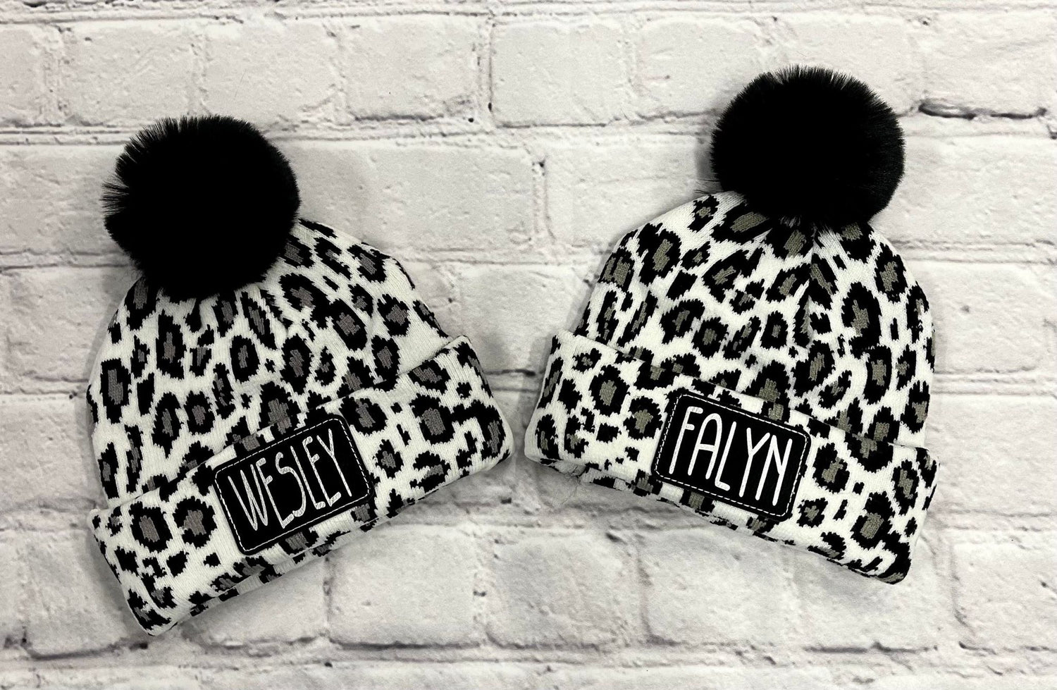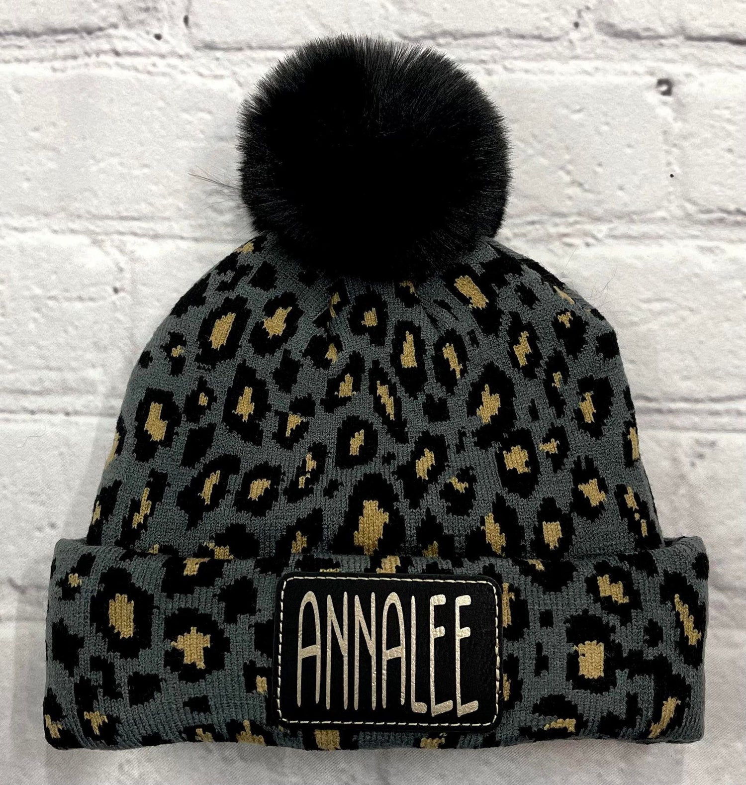 Youth Personalized Plush Knitted Leopard Print Beanie Caps Pom Pom, with Engraved Leather Patch